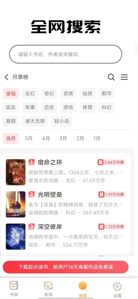 4、之后进入搜索界面,这个里面可进行全网搜索小说。