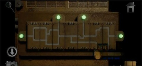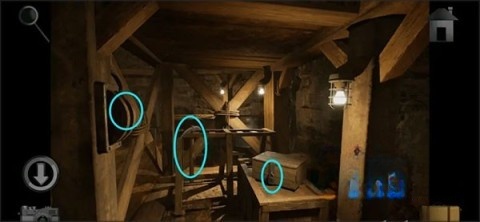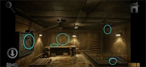 5、拿起钥匙,打开区域左侧的储藏室。走进储藏室后,留意墙上的提示信息,然后取走桌子上的「断线钳」。随后,点击左边的机关,转动轮盘,使锁链降下。