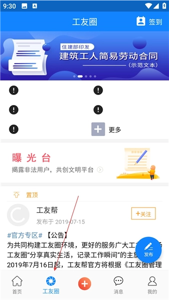 3、点工友圈,浏览建筑工人合同、曝光台内容,关注工友帮,参与交流,分享工作生活。