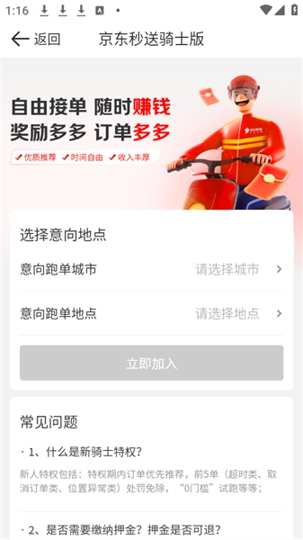 达达秒送骑士,一款超有趣的配送软件。在这里,用户能化身跑腿骑士,接收各类任务并完成配送,进而获取相应的跑腿佣金。而且,软件会依据地区自动匹配最优订单,有效提升工作效率,保障准时送达。新入职的伙伴不必担忧,平台提供专业培训指导,让你轻松上手兼职工作。感兴趣的用户,快来达达秒送骑士软件体验一番吧!