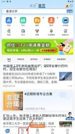 1. 在本页面完成并打开后,点击底部“院校”选项,进而进入院校分类页面。