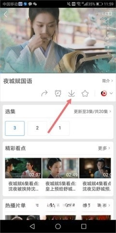 1、在电视剧播放页面,点击播放画面下方的图标(见下图红色箭头所指区域)。