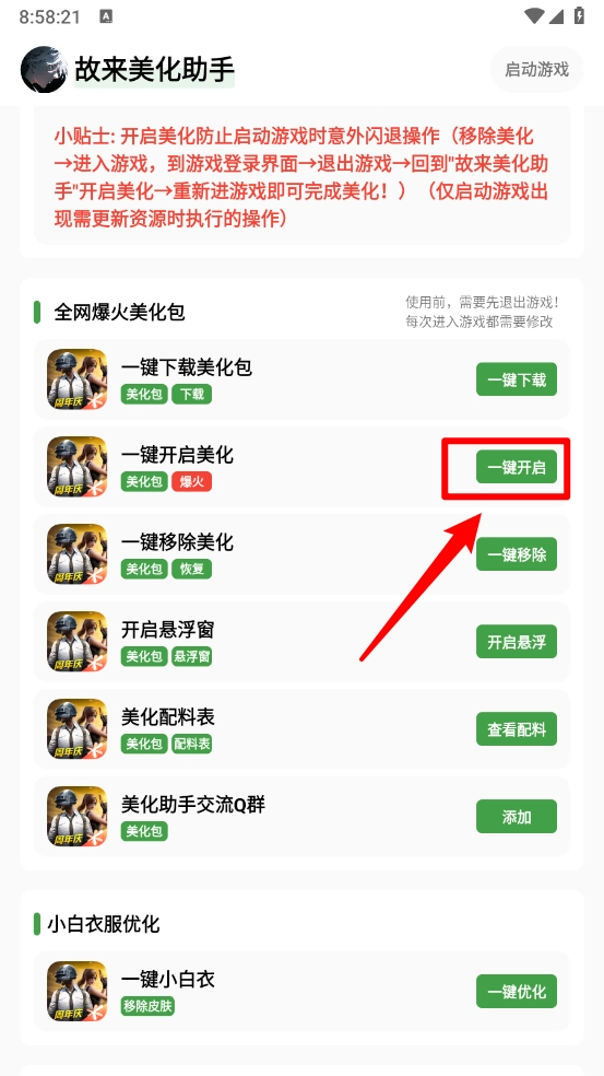 小贴士:开启美化防止启动游戏时意外闪退操作(移除美化 →进入游戏,到游戏登录界面→退出游戏→回到"故来美化助手"开启美化→重新进游戏即可完成美化!(仅启动游戏出现需更新资源时执行的操作)