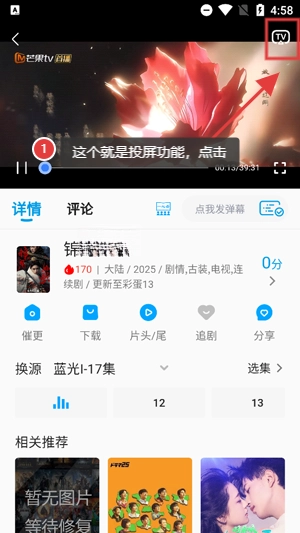 在播放界面点击画面右上角的投屏功能,小电视图标。