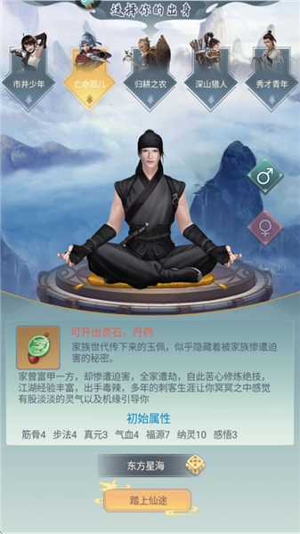 1、正式开局前玩家可以选择自己的出生与性别,不同的出生会有不同的属性和获得物品。