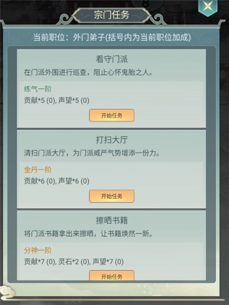 4、每天都可以和掌门请安,完成宗门任务可以获得额外的资源和贡献。