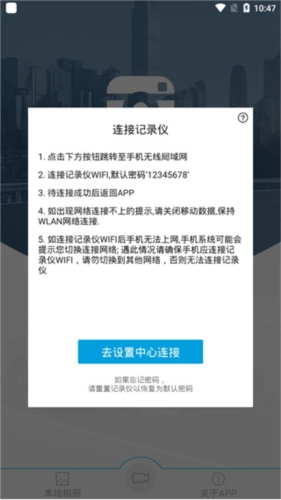 2、点击下方按钮跳转至手机无线局域网,连接记录仪WIFI,默认密码'12345678';