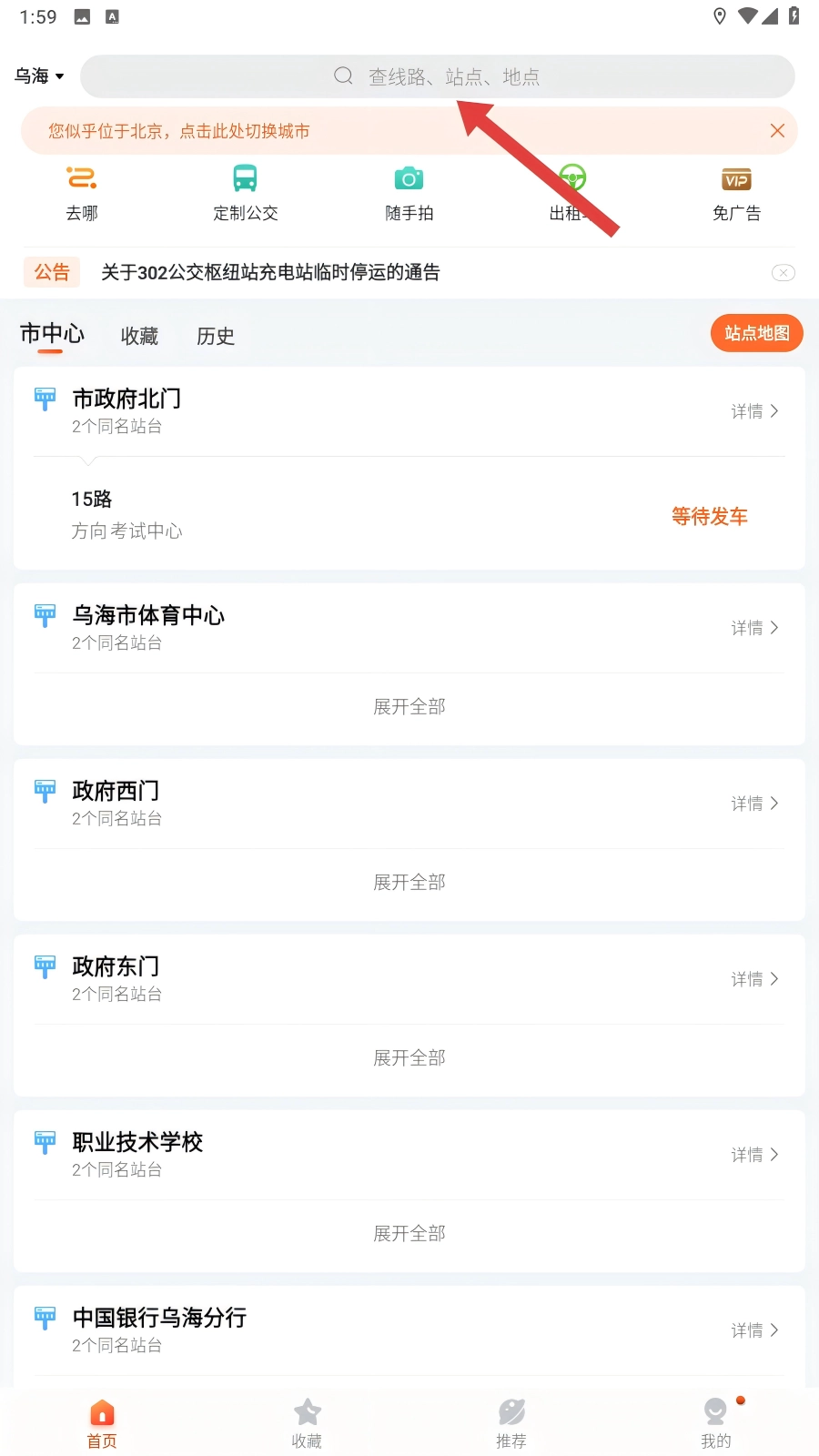 1. 开启掌上公交,轻点顶部的【查线路、站点、地点】搜索框,输入相关信息就能启动公交查询,让您的出行从此便捷无忧。