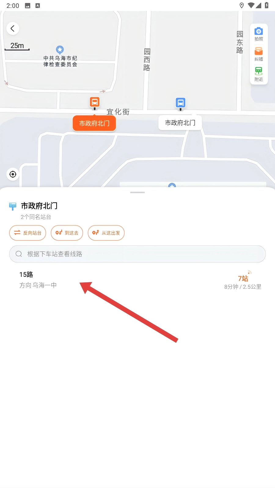 3、打开【市政府北门】站点的页面,在其中找到15路公交车,这样就能查看它的行驶方向、剩余站点等信息,让您等车时能更好地规划时间。