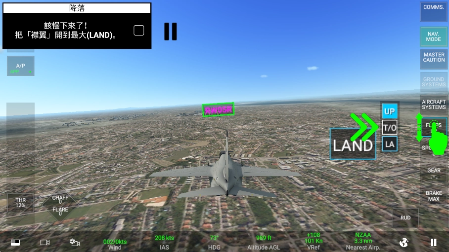 4、整个过程中需要控制好机身,不要倾斜,与地面成平行姿态,因为开启了辅助功能,所以最好不要操控飞机的方向,除了对准跑道,随后按住屏幕右侧的“FLAPSUP”,向下滑动,到LA。