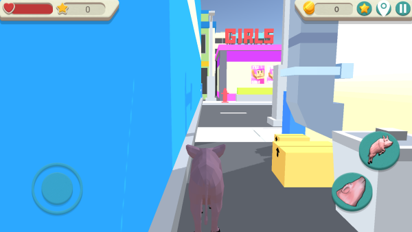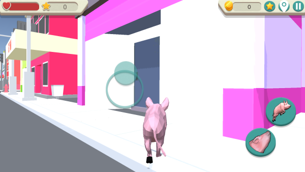 1、以小猪的视角展开游戏,滑动左侧的虚拟摇杆,控制猪猪移动。