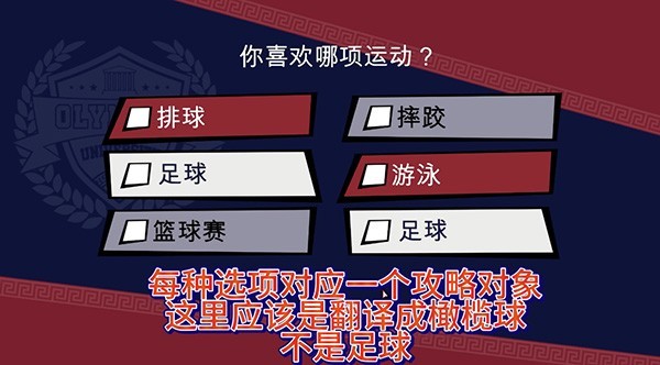 2、挑选心仪的运动,每个选项都对应一位攻略对象,需注意,这里足球的表述有误,实际应为橄榄球。