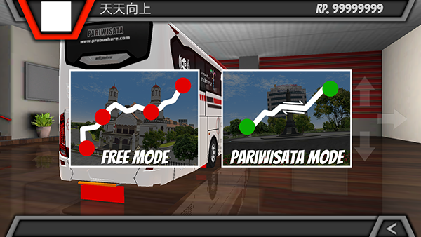 4、游戏模式选择:左侧红点所标记的是自由驾驶模式,在此模式下可随意行驶,但不能载客;右侧绿点代表任务模式,该模式需要按照地图路线接载乘客,并将其送达指定站点。