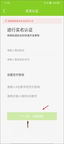(3)开展实名认证,填入真实姓名、身份证号码以及支付密码,随后启动“人脸识别”。
