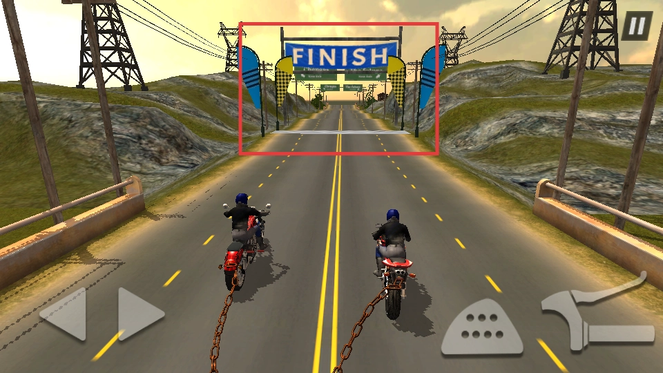 3、在赛道上疾驰时,留意前方【红框内的“FINISH”标志】,在铁链还连接在一起的前提条件下,全力冲向终点完成比赛。