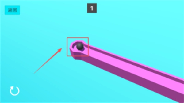 3、在第一关中,你需要操控小黑球沿着紫色轨道前行,同时要留意左上角的返回按钮以及右上角的关卡标识。
