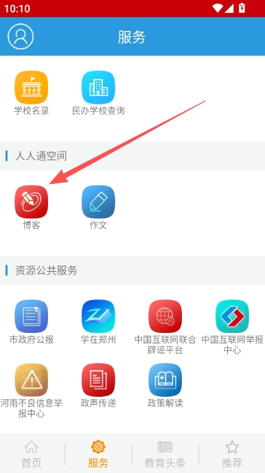 1、点击服务版块,选择资源公共服务版块学在郑州打开进入。