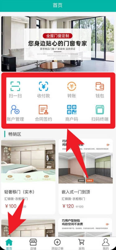 2、在首页可看到扫码、收付款、转账、钱包、合同签约、商户码等功能入口,方便管理日常业务与收支。