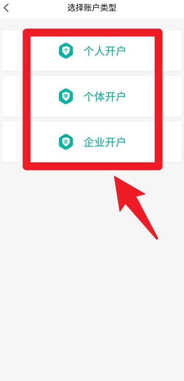 4、在账户类型页面,你可以选择个人开户、个体开户或企业开户,根据需求灵活开设合适账户类型。