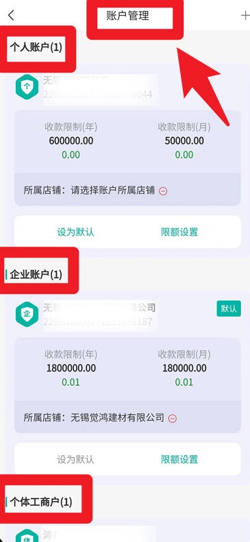 5、进入账户管理,可查看个人账户、企业账户和个体工商户的详细情况,支持额度设置与账户默认选择。