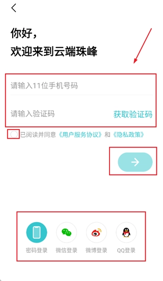 输入手机号,验证码,勾选已阅读并同意 《用户服务协议》 和 《隐私政策》,点击向右箭头登录即可,还可以选择密码登录,微信登录,微博登录,QQ登录等方式登录