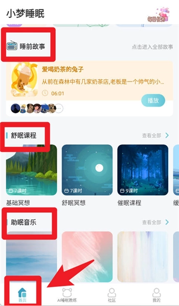 3、首页更提供睡前故事、舒眠课程与助眠音乐等板块,让身心逐渐放松,轻松入睡。