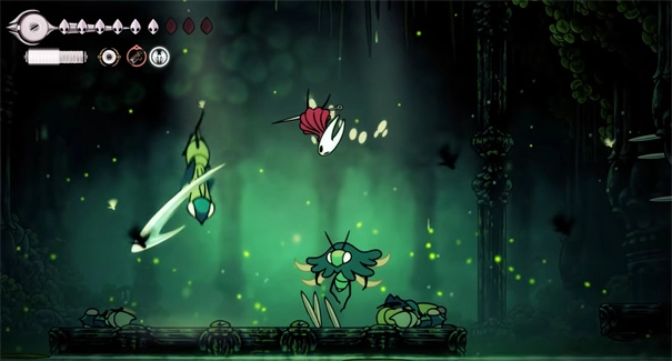 其次是惯性,不像前作空洞骑士那样跳跃过程中可以随时转身,丝之歌的惯性极其明显,一开始有一点不适应,但习惯后会发现跟《蔚蓝》手感比较像(蔚蓝也是一款老游戏)。