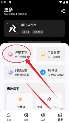 6、如果在中找不到感兴趣的软件,可以在【更多】里提交【许愿求软】的请求,反馈软件需求。