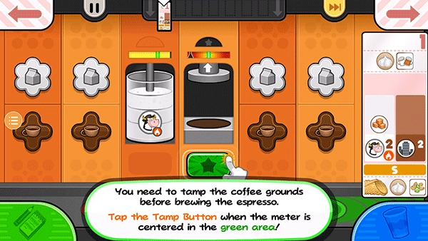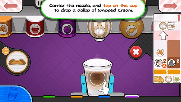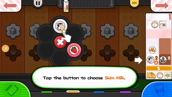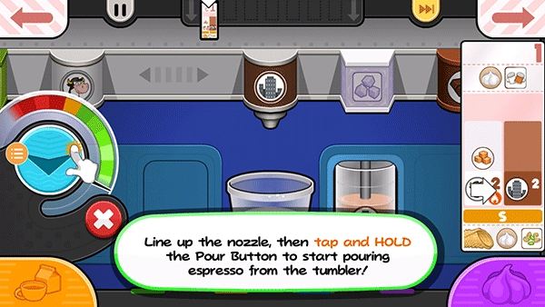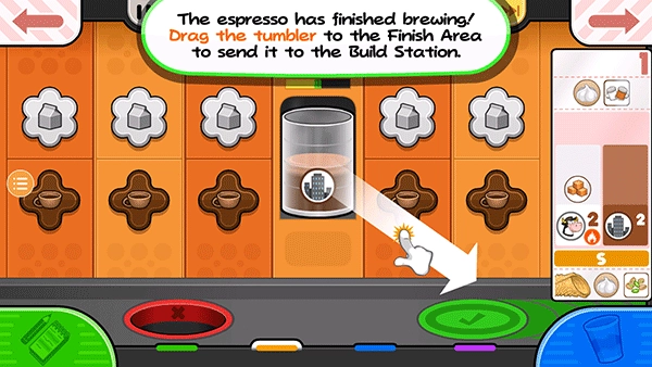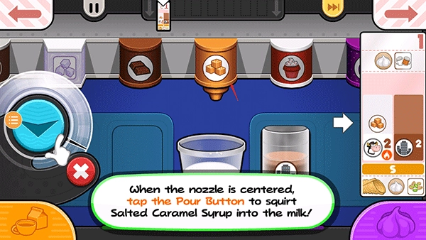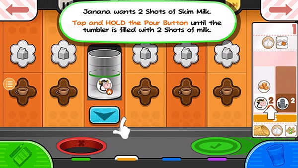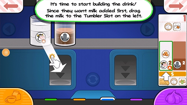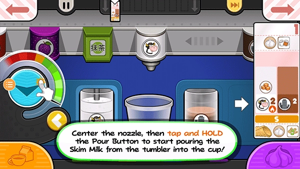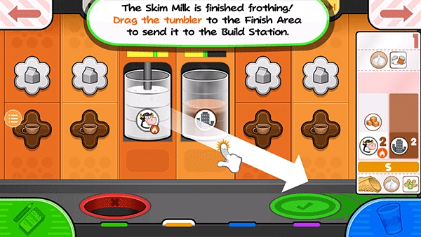 15、从小票左边的项目开始拖动容器,使左边的脱脂牛奶杯喷嘴在杯子上方居中。按住倒奶按钮继续添加脱脂牛奶!如果仪表接近红色区域,释放倒按钮,等待指针下降,然后再倒更多!