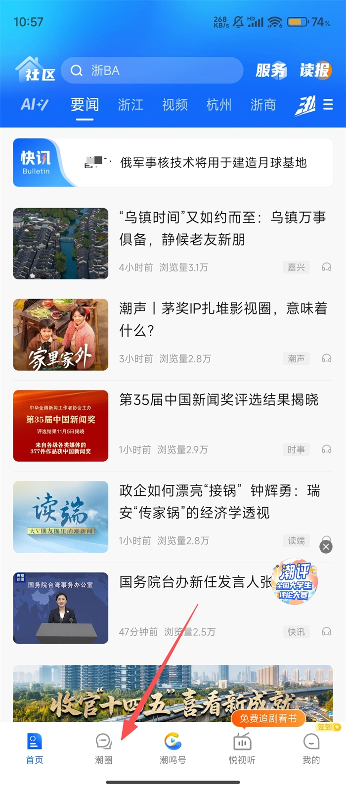 1、若要进入社区互动页面,在打开潮新闻后,点击底部的【潮圈】按钮即可。