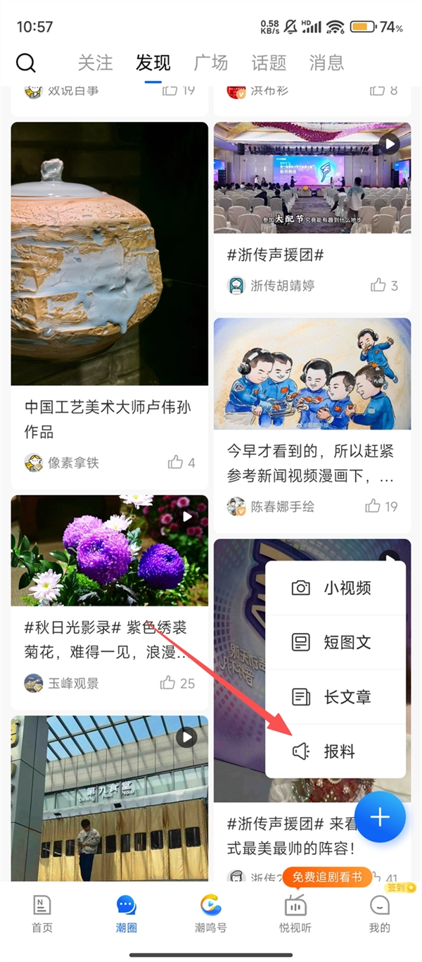 3、在展开的选项中,我们可以点击【报料】,进入投稿界面啦。