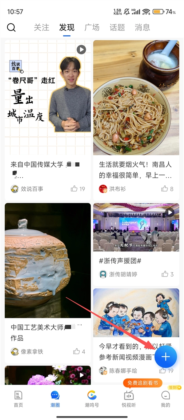2、在潮圈页面,点击右下角蓝色【+】按钮,展开创作选项呢。