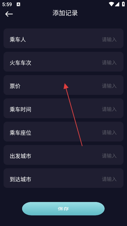4、在编辑界面,输入乘车人、火车车次、票价、乘车时间等信息后点击【保存】,可添加火车出行记录。