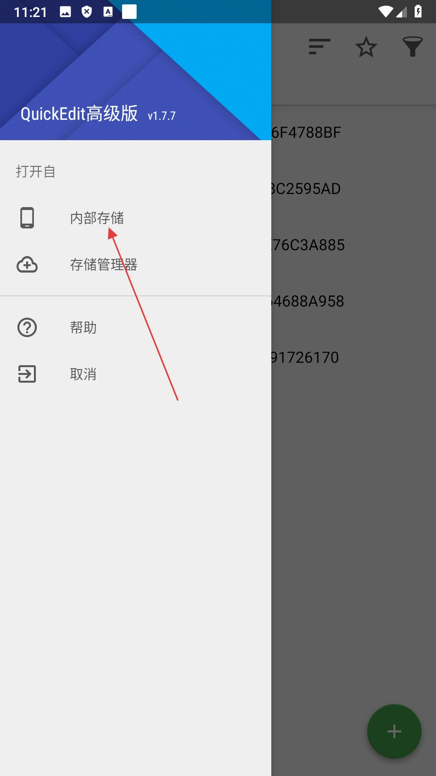 3、在打开文件选择页面,点击【内部存储】,进入内部存储文件列表页面。