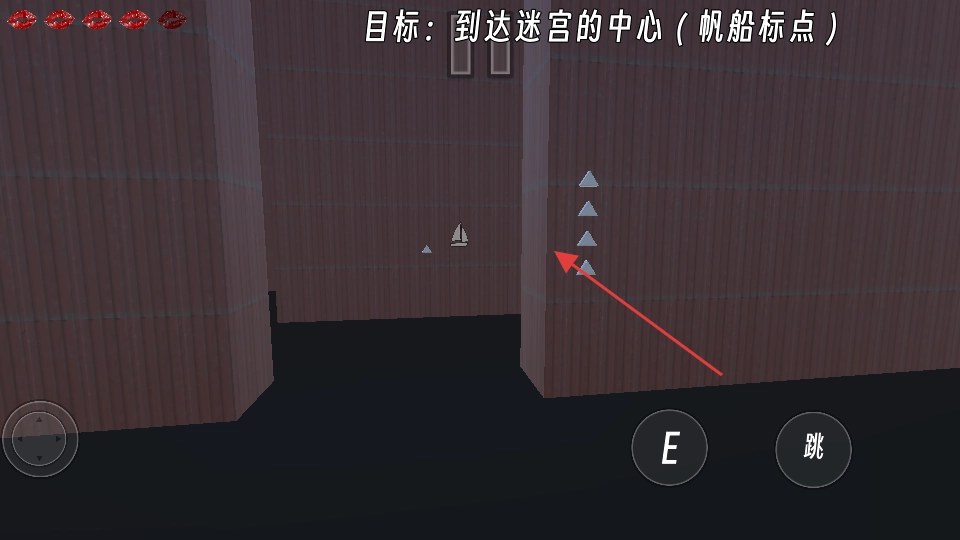 2、在迷宫里,沿着带有【三角形】标记的墙壁前行,朝着【帆船】标点进行探索,要留意方向,防止迷路。