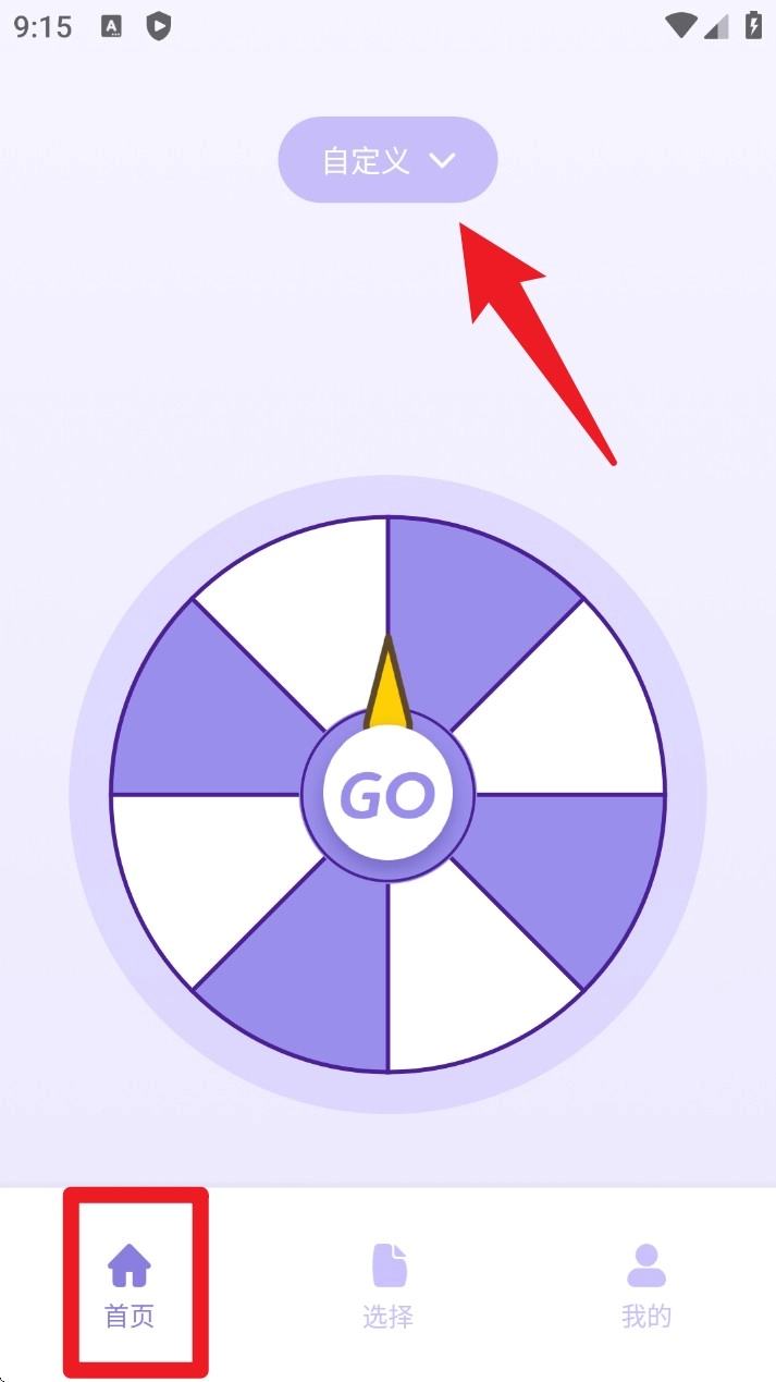 1. 进入首页,点击转盘上方的自定义按钮,选择你想使用的选项分组,开始你的转盘选择之旅。