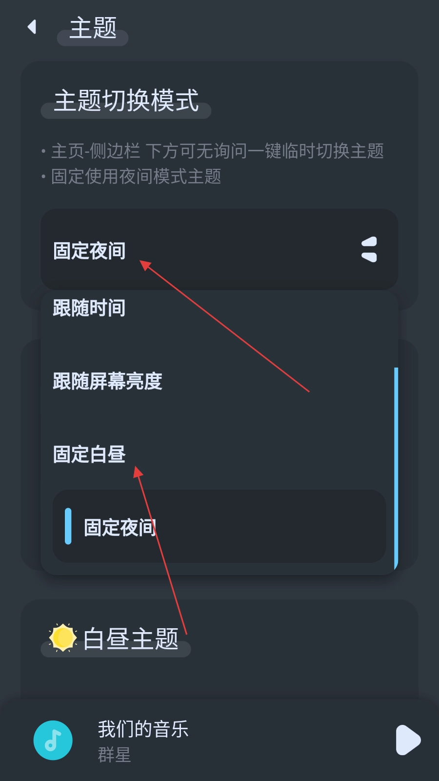 4、在主题设置页面,点击【固定夜间】选择【目标主题模式】,即可完成主题设置操作。