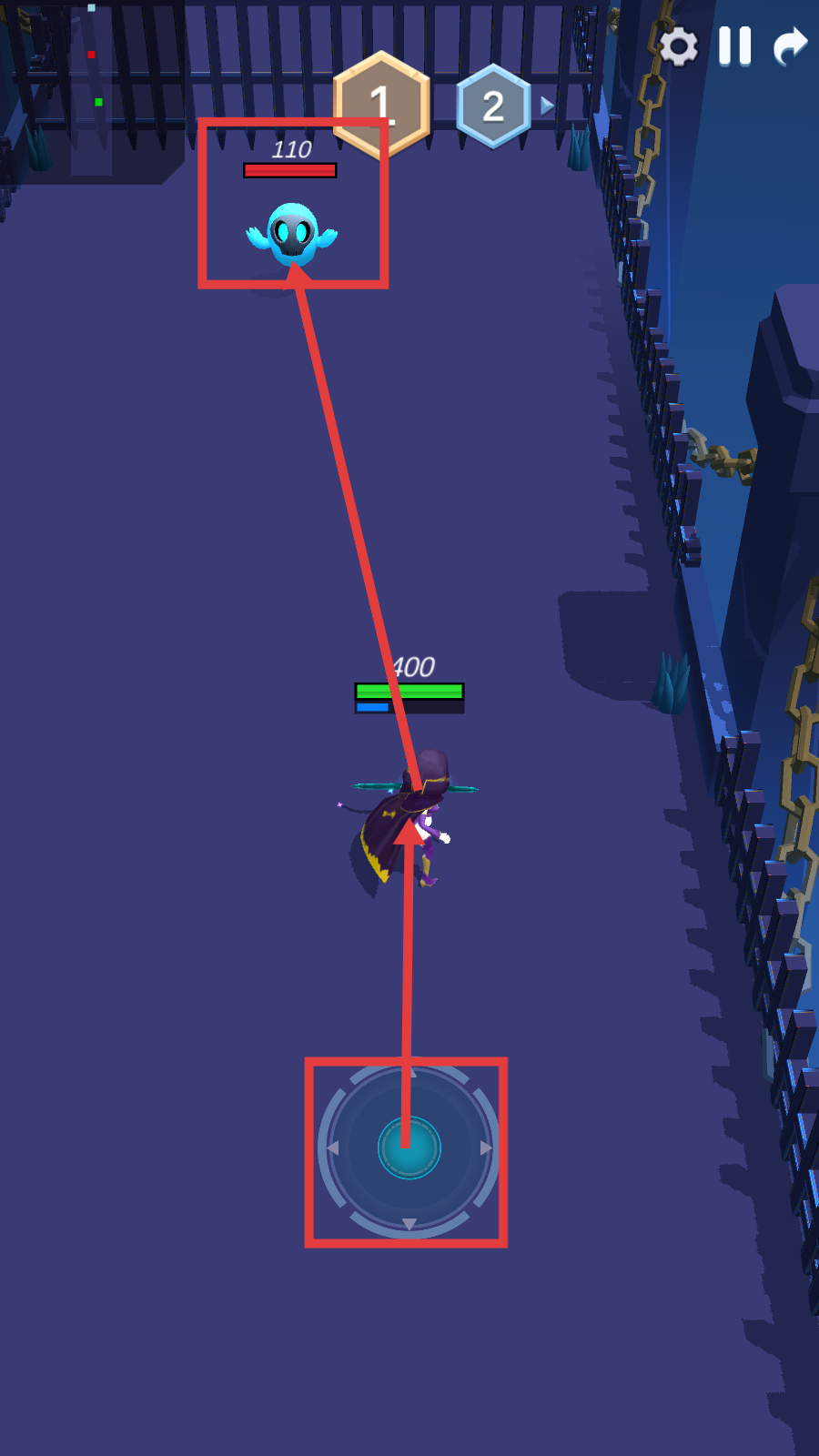 2、战斗时操控下方轮盘移动角色,瞄准【110】血量的怪物攻击,注意走位躲避。