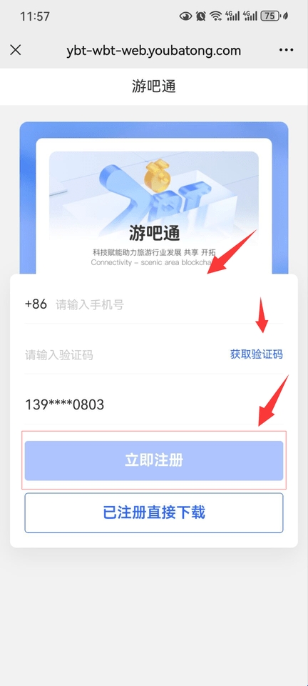 1. 用手机微信或浏览器打开扫一扫功能,输入自己的手机号,点击获取验证码。待手机收到验证码后,输入验证码,再点击立即注册。