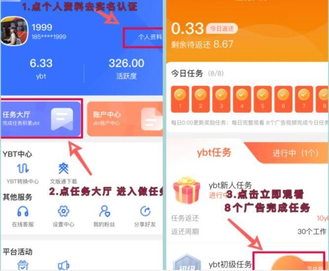 2:成功登录游吧通后,点击“我的”,接着点击个人资料进行实名认证。(游吧通作为一款涉及旅游线路报名、购车票、订酒店等生态服务的应用,这些操作都必须采用实名制,所以需要进行实名认证。)认证完成后,再点击任务大厅。新注册用户,公司会赠送一个YBT新人任务包和一个新人茶山。领取任务后,点击“立即观看”,每天观看8个视频任务,即可获得积分奖励。