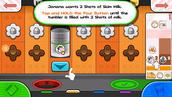 15、从小票左边的项目开始拖动容器,使左边的脱脂牛奶杯喷嘴在杯子上方居中。按住倒奶按钮继续添加脱脂牛奶!如果仪表接近红色区域,释放倒按钮,等待指针下降,然后再倒更多!