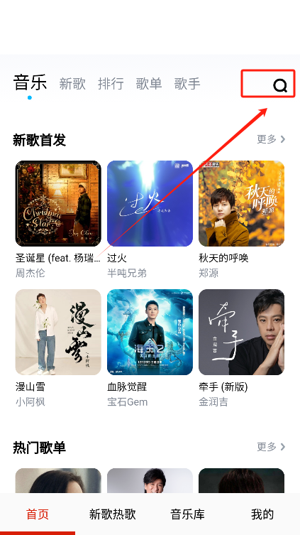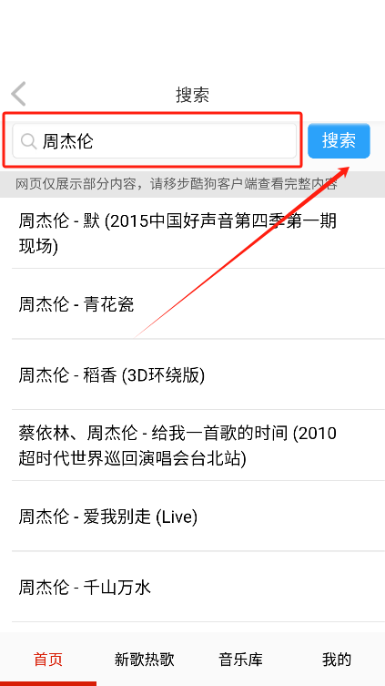 2. 在首页或搜索栏输入想听的歌曲或者关键词,点击搜索。