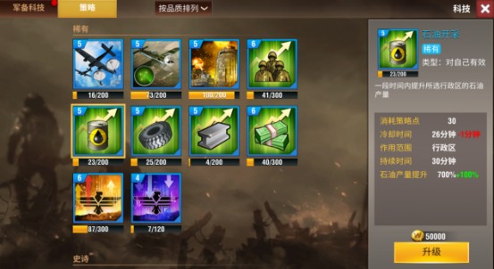 3、相比科技系统,策略优先级略低。平民玩家建议优先投入资源提升科技等级,若有剩余精力,可针对性地强化部分实用策略以增强实战能力。