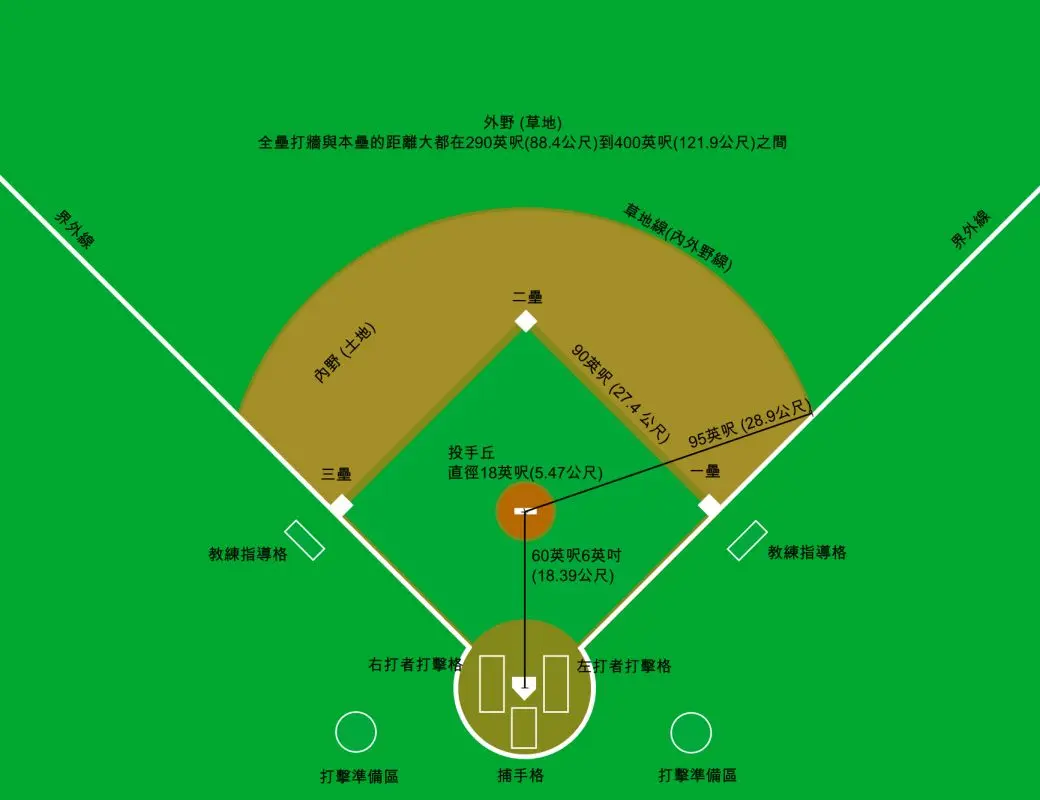 在内野与外野之间会有界线,以内的区域,称为内野,通常会铺上红土;反之称为外野,通常为草皮。本垒和二垒连线上,接近正方形中心区域,会有一个投手丘,那是投手投球的位置,击球员则会站在本垒旁准备击球。