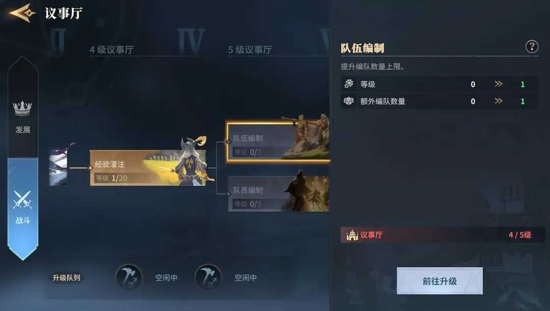 3、第一天尽快提升主城等级,解锁队伍编制科技,可以解锁第二队、第三队!这样就能有多队伍可以玩。