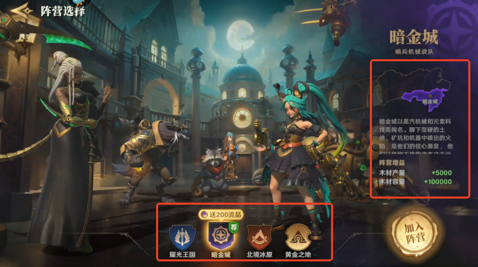 2、进入游戏后会让玩家选择4个阵营,推荐的暗金城会额外赠送200流晶,暗金城事一个蒸汽朋克的势力。