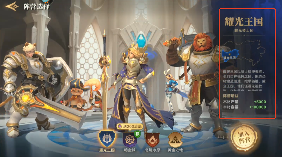 3、下方可以切换阵营,比如我们切换到曙光王国,则是一个骑士风格的阵营,从盔甲就能看出防御力应该拉满了。