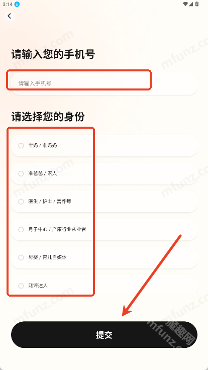 4、填写手机号,选择身份,点击提交