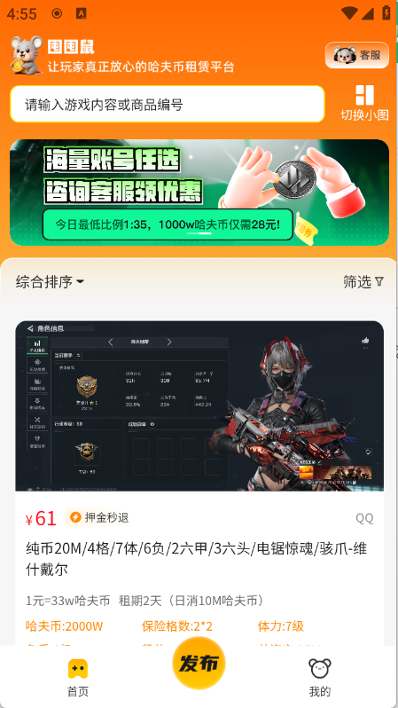 囤囤鼠这款软件,能让用户交易各类游戏的账号,同时还支持游戏账号租赁。在这里,热门游戏账号信息一应俱全,用户可轻松掌握。软件涵盖了多种类型的游戏账号,像原神、王者荣耀、蛋仔派对等,助力大家迅速找到想租用的账号。