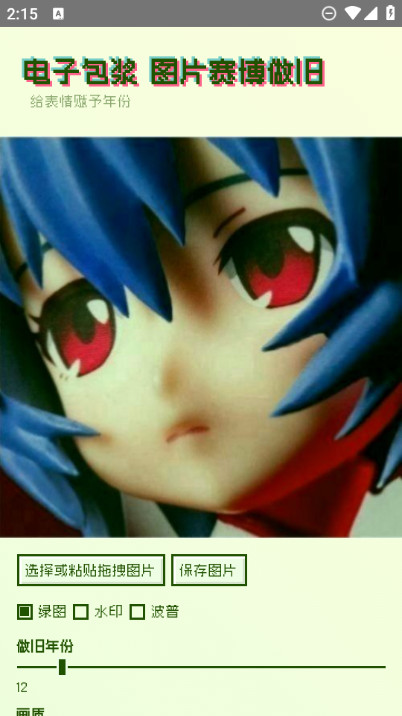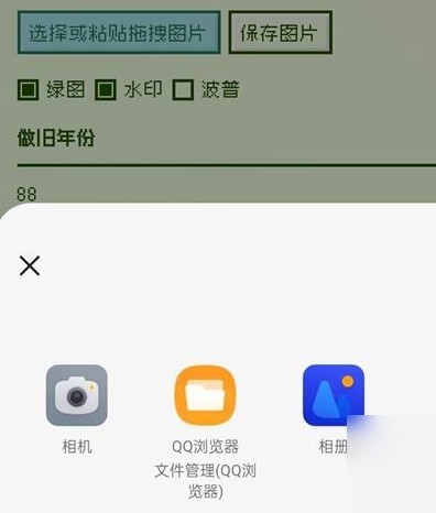 2、选好之后就能着手修改图片了,可添加【绿图】【水印】【波普】效果,也能调整图片的做旧年份。